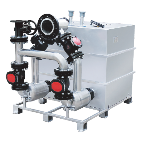 含雜質(zhì)污水在重力作用下流入污水排水設備進(jìn)水口,經(jīng)過(guò)固液分離箱,渣物暫存在固液分離箱內,而分離渣物后的污水流入設備集水箱;當集水箱的液位達到啟泵液位時(shí),啟動(dòng)排污泵進(jìn)行排水,排出來(lái)的污水經(jīng)過(guò)固液分離箱,并把分離箱內的雜物隨污水排入市政管網(wǎng)。